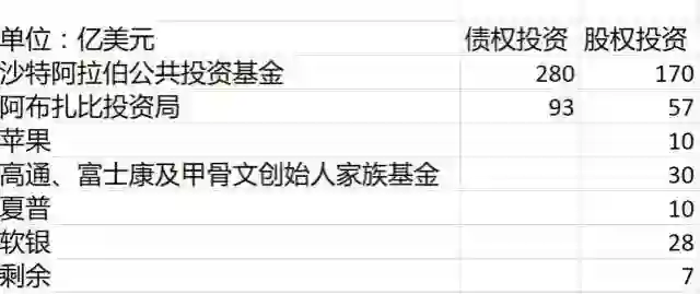 例如,沙特阿拉伯公共投资基金所投资的450亿美元资金中,约280亿美元以优先债形式存在,剩余170亿美元以股权形式存在,阿布扎比投资基金总共投入的150亿美元中,有93亿美元以优先债形式存在,在所有融资来源中,只有软银自身投入的280亿美元全部为股权形式。