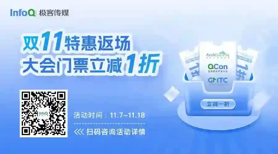 InfoQ 技术大会双十一活动开启啦,没有套路,购票立减一折。QCon 全球软件开发大会、ArchSummit 全球架构师峰会、GMTC 全球大前端技术大会...,各大品牌均参加活动。了解更多活动详情欢迎咨询小助手:15600537884(微信同电话)