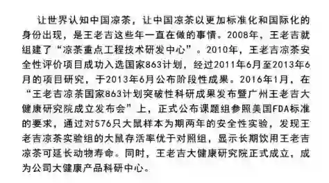而 到了2016年,广药集团在“王老吉凉茶国家863计划突破性科研成果发布暨广州王老吉大健康研究院成立发布会”上,正式对外公布研究获得了突破:863 计划按照国家标准及美国FDA标准,完成国内首个凉茶产品3年安全性系统研究,取得重大突破性成果:长期饮用王老吉凉茶可延长动物寿命。研究成果证明,长 期饮用王老吉凉茶对身体健康有积极的作用。