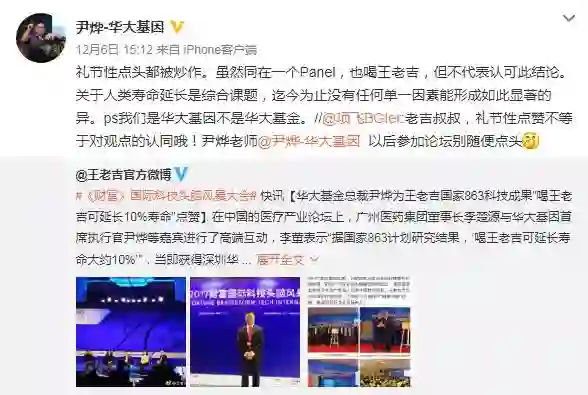 他在微博上表示:礼节性点头都被炒作。虽然同在一个Panel,也喝王老吉,但不代表认可此结论。关于人类寿命延长是综合课题,迄今为止没有任何单一因素能形成如此显著的异。ps我们是华大基因不是华大基金。(王老吉的微博小编怕是要扣光鸡腿喝小米粥了)