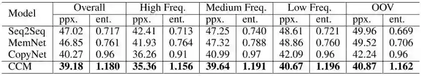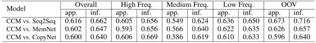 从图5中可见,CCM对于三个基线系统来说,都有将近60%的回复是更优的。并且,在OOV的数据集上,CCM比seq2seq高出很多,这是由于CCM对于这些低频词或未登录词,可以用知识图谱去补全,而seq2seq没有这样的知识来源。