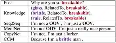 如下图6所示,当在post中遇到未登录词“breakable”时,seq2seq和MemNet都只能输出一些通用的、模棱两可的、毫无信息量的回复。CopyNet能够利用知识图谱输出一些东西,但是并不合适。而CCM却可以输出一个合理的回复。