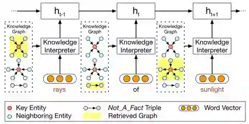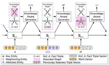 如图所示,当编译到“rays”时,会把这个词在知识图谱中相关的子图得到(图2最上的黄色高两部分),并生成子图的向量。每一个子图都包含了key entity(即这里的rays),以及这个“rays”的邻居实体和相连关系。对于词“of”,由于无法找到对应的子图,所以就采用特殊子图Not_A_Fact来编译。之后,采用基于静态注意力机制,CCM会将子图映射为向量,然后把词向量 w(x_t) 和 g_i 拼接为,并将这个替换传统encoder-decoder中的 e(x_t) 进行GRU计算。