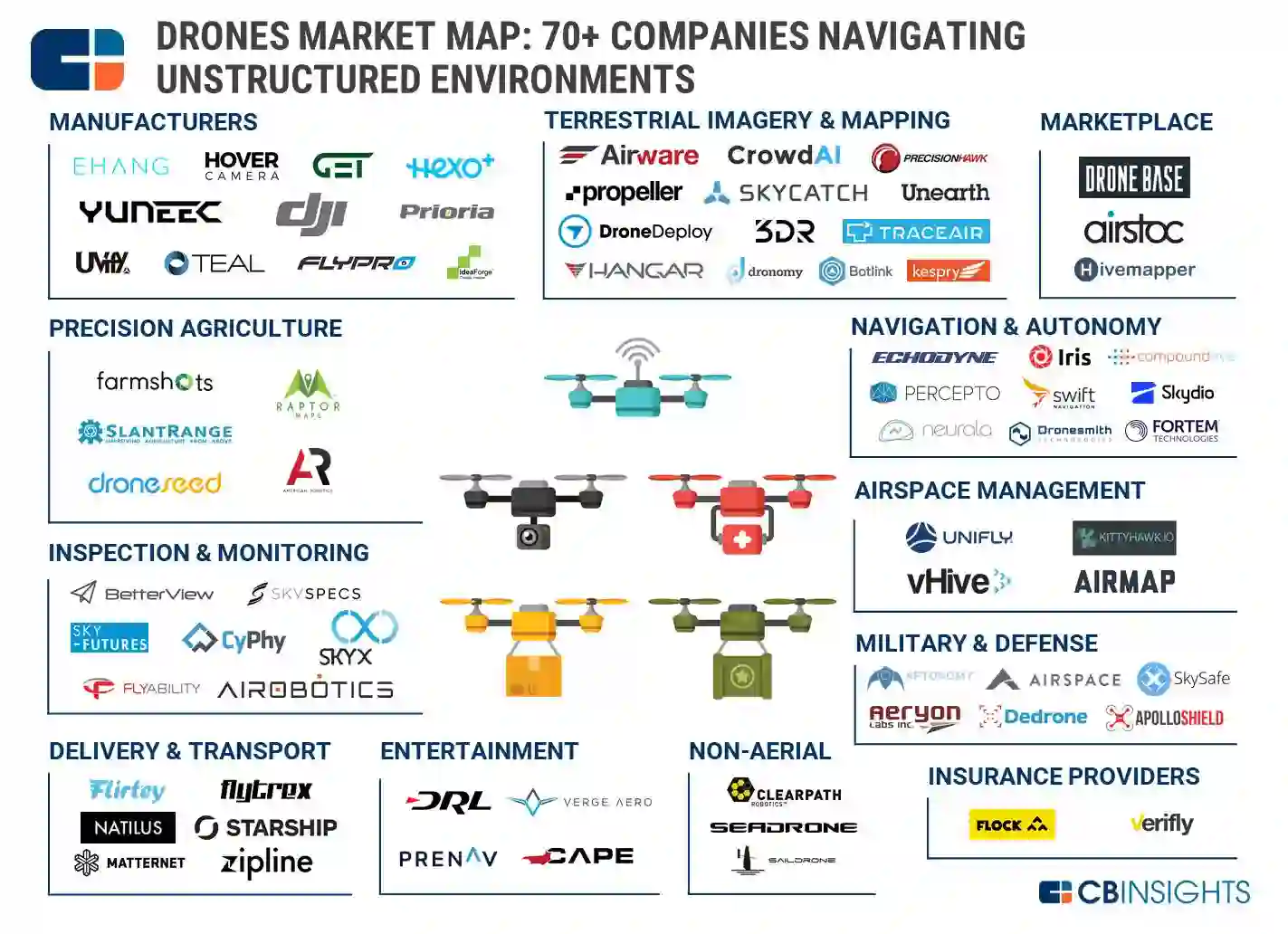 最近 CB Insights 总结出了无人机领域的 70 多家主要私营公司,并根据运营情况将他们分为十二个主要类别。他们对无人机公司的定义比较宽泛,开发在非结构化环境下的无人机、水(或)陆载运工具及相关技术的软件和硬件公司都属于无人机公司范畴。这些技术囊括了无人机制造和其他应用对无人机所收集数据的分析。