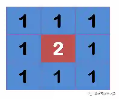 "中间点"取"周围点"的平均值,就会变成1。在数值上,这是一种"平滑化"。在图形上,就相当于产生"模糊"效果,"中间点"失去细节。