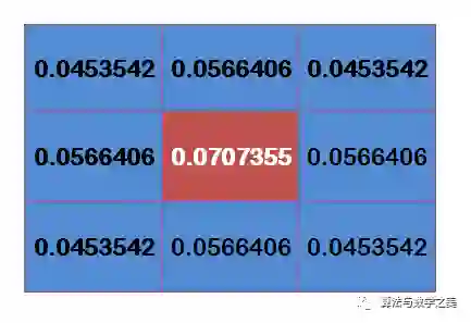 这9个点的权重总和等于0.4787147,如果只计算这9个点的加权平均,还必须让它们的权重之和等于1,因此上面9个值还要分别除以0.4787147,得到最终的权重矩阵。
