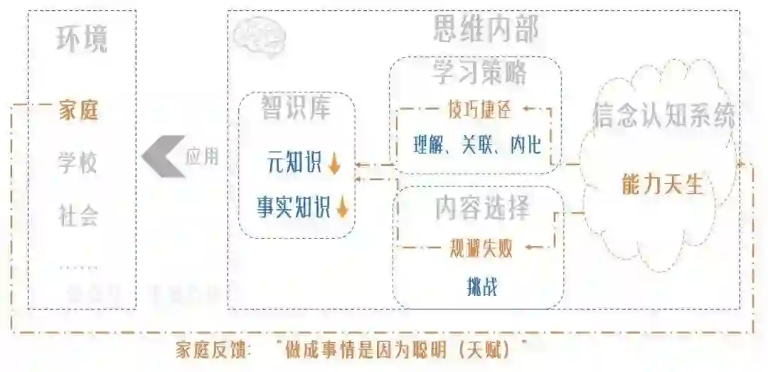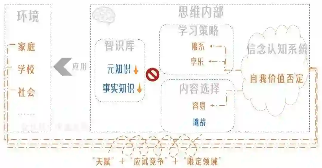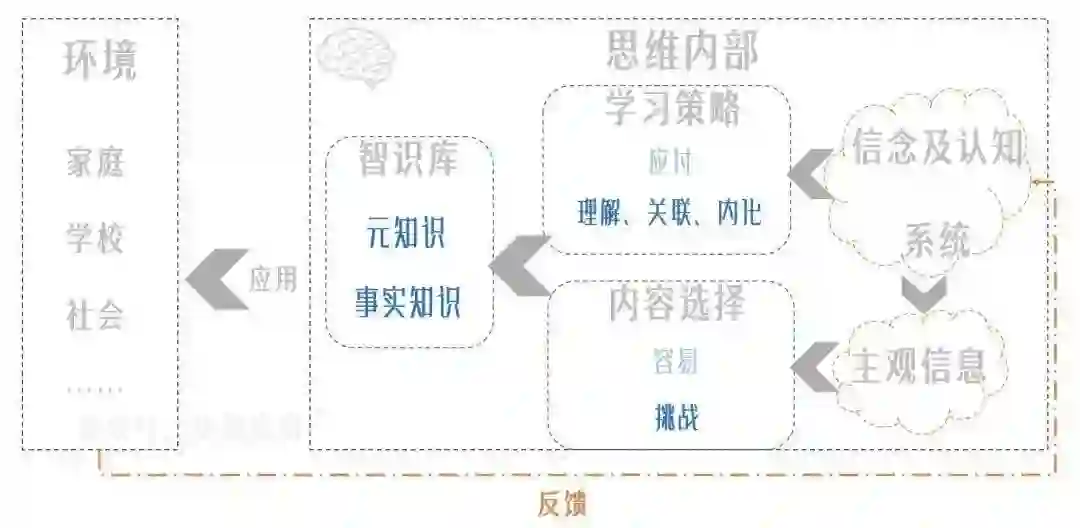 我们的学习策略、学习内容选择又受制于“信念及认知系统”;“信念及认知系统”则取决于我们将“智识库”应用于环境后的“反馈”(橙色字体),即“反馈”是否达成我们的期望。