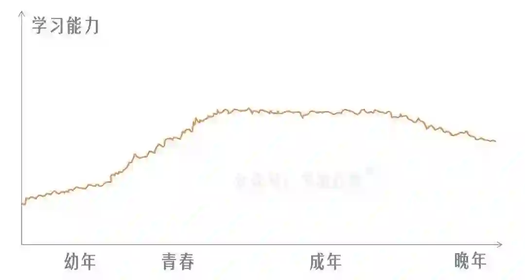即:幼年到成年,大脑一直在发育,智力跟着提升,而随着“自控力”变强,注意力也随着提升,于是学习能力整体一直在上升,直到成年期,学习能力保持平稳,最后老年了开始衰退。
