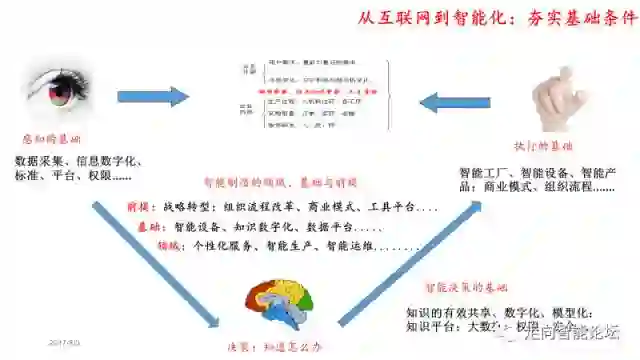 基础条件变了,人应该怎么办?人应该主动地迎接这个时代、适应这个时代,而不是被动地被淘汰。这才是人的智能啊。对工业企业,就是要推进两化的深度融合。深度融合的表现之一,是为智能化创造条件、适应市场的需要。其中,一切数字化就是为信息的处理和传递创造条件,商业模式和组织流程的改变也是创造条件。