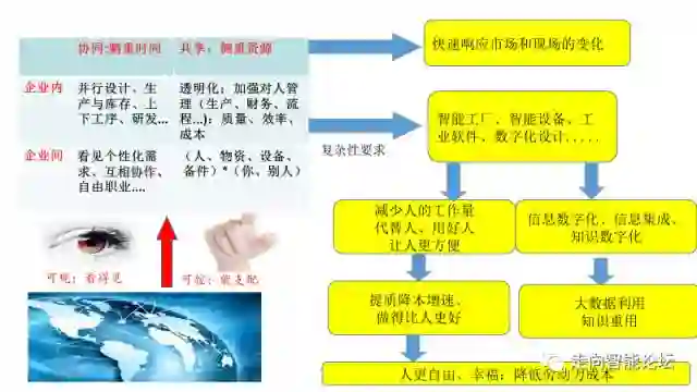 比如,我常说:协同、共享和重用,是智能制造创造价值最常见的方式。那么,为了能够更好地做到这一点,就要为推进“协同、共享和重用”创造条件。例如:业务流程的改变、人机合作方式的改变、组织体系的改变、商业模式的改变、工厂设备的改变等。换句话说,我们要在一定程度上强调,智能化为业务创新服务。