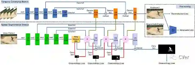 在视频目标分割任务中,为了保持时序一致性,大多数方法使用光流。但是光流需要大量的人工标注并且经常出现误差。为了解决这个问题,我们提出了一个统一的,可以端到端训练的时空卷积网络来解决视频目标分割任务,避免依赖光流。我们的模型由时域一致性分支和空域分割分支组成。时域一致性分支采用对抗方式以及无标注视频数据预训练,它可以捕捉目标表观的动态和运动信息,从而提高分割的时序一致性。空域的分割分支关注通过学到的表观和运动信息得到准确的分割结果。为了得到准确的分割结果,我们设计了一个从粗到细的多尺度注意力模块。通过这个模块,分割分支会逐渐关注目标区域。两个分支可以联合端到端训练。广泛的实验证明我们的方法取得了与目前最好方法的相近性能。