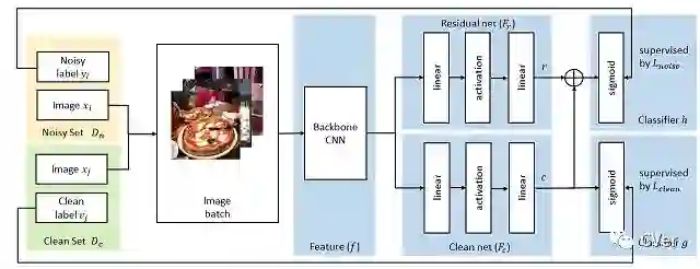 弱监督学习是计算机视觉任务中的一个重要问题,比如图像分类,物体识别等,因为其可以工作于干净标签不可用的大规模数据集。然而,尽管有许多关于弱监督图像分类的研究,这些方法通常局限于单标签噪声或者多标签噪声场景。本文提出了一种有效的弱监督图像分类方法,使用了大量噪声标注数据和少量干净标注数据(比如5%)。该方法由一个主干网络,一个净化网络(clean net)和一个残差网络(residual net)组成。具体来说,主干网络用于学习图像特征,净化网络用于学习从特征空间到干净标签空间的映射,残差网络用于学习从特征空间到标签残差(干净标签和噪声标签之间)的映射。因此,残差网络以类似于正则项的工作方式增强净化网络的学习。我们在两个多标签数据集(OpenImage和MS COCO2014)和一个单标签数据集(Clothing1M)评估了该方法。实验结果表明,该方法优于现有的最好方法,并能对于单标签和多标签场景有很好的泛化能力。