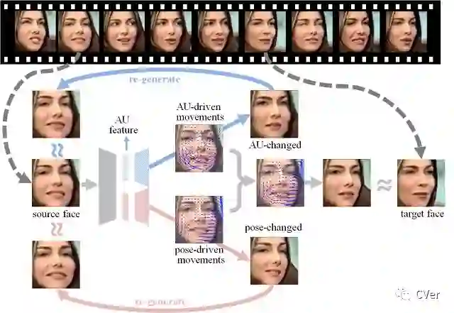 我们提出了一种能够在不依赖AU标签的前提下,从人脸视频数据中自动学习AU表征的方法(Twin-Cycle Autoencoder,TCAE)。该方法以两帧人脸图像之间的运动信息为监督信号,驱使模型预测出的两帧人脸图像之间的运动信息。考虑到两帧图像之间的运动信息包含了AU以及头部姿态(pose)的运动,TCAE通过一定的约束,使得模型能够提取出与头部姿态无关的运动分量。该方法的核心在于,模型分别提取了两张输入图像的AU-specific以及pose-specific的表征,用于解码出AU-specific以及pose-specific的运动分量。