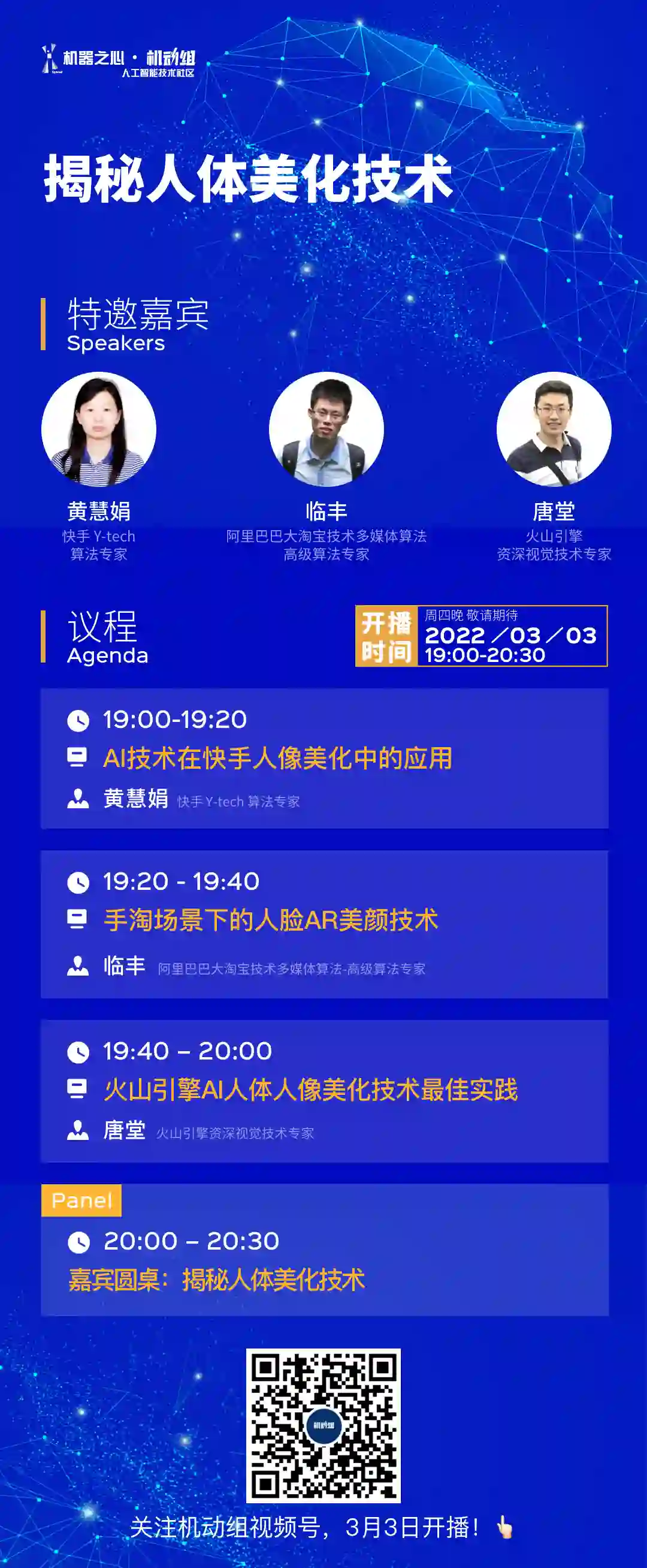 在 3 月 3 日 19:00-20:30 的技术分享中,机器之心机动组将以「揭秘人体美化技术」为主题,邀请多家代表企业,为大家解密这些特效背后的相关技术。