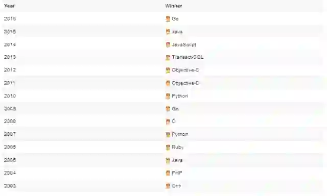 “年度编程语言”获奖名单如下图所示,该奖项授予一年中评分最高的编程语言: