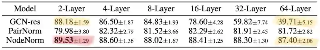 上表展示了几种尝试解决深度问题的方法,包括残差连接和两种归一化技术。可以看出随着网络层级加深,GCN-res 效果急剧变差。PairNorm 相对稳定,但降低了性能。NodeNorm 效果最佳,但它的最佳效果是在两层图网络时取得的。这个实验告诉我们,要将深度图网络带来的提升和训练它所需要的技巧分开讨论是很难的。