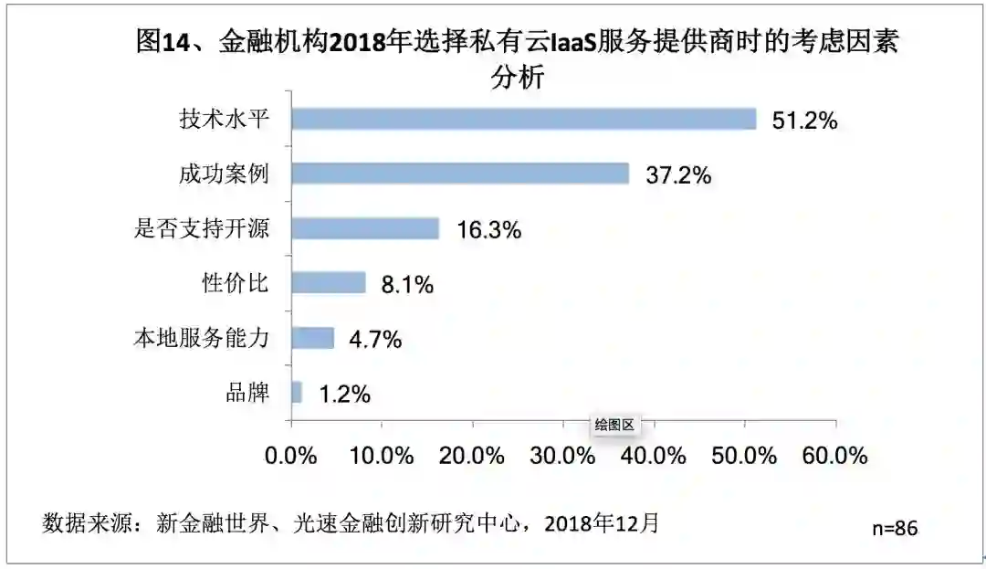 在已经建设私有的中国金融机构中,选择IaaS 服务提供商的时候最主要考虑的因素是技术水平(51.2%),其次是 IaaS 服务提供商的经验(成功案例 37.2%)和是否支持开源系统(16.3%)。