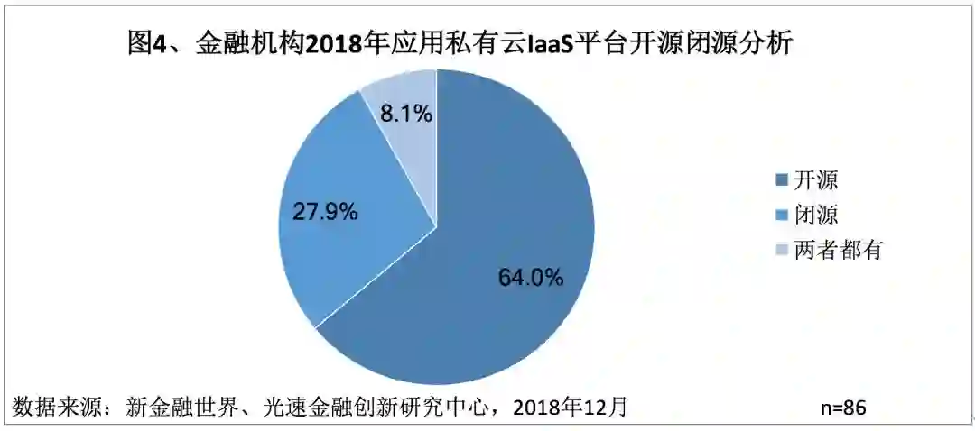 到 2018 年 11月底为止,中国金融机构目前采用的私有云 IaaS 平台中64% 基于开源系统,27.9% 是基于闭源系统,开源闭源系统皆有的占整体比例的 8.1%。而在展望 2019 年中国金融机构目前采用的私有云 IaaS 平台建设的时候,71.6% 的中国金融机构选择采用开源平台,选择闭源系统的仅占13.7%。