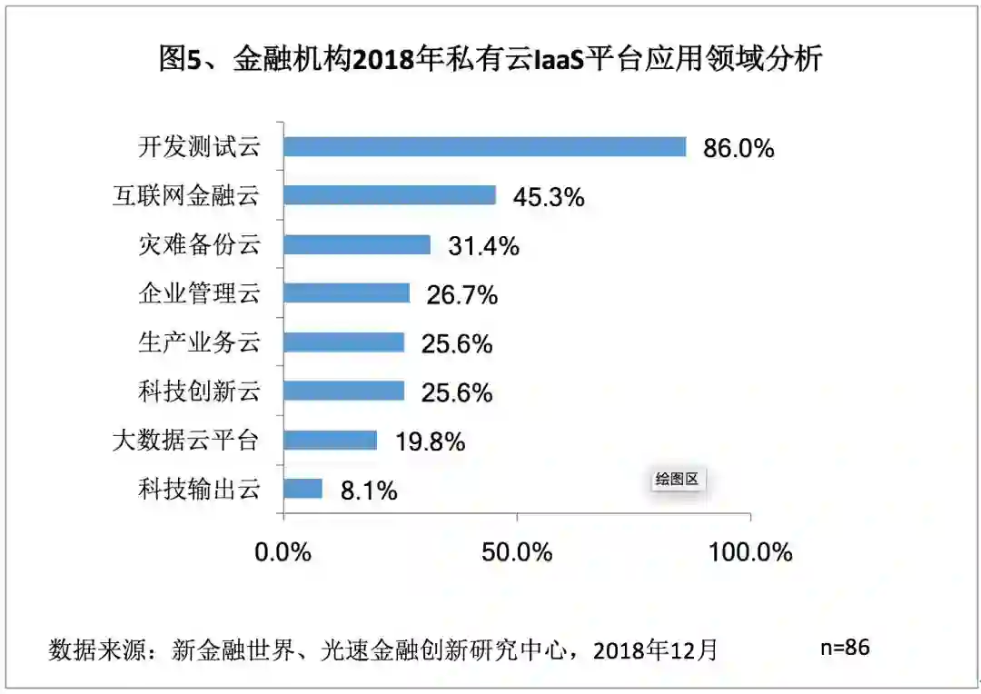 在已经建设私有云的中国金融机构中,私有云平台应用最多的是开发测试(86%),其次是用于互联网金融业务(45.3%)和灾难备份(31.4%)。