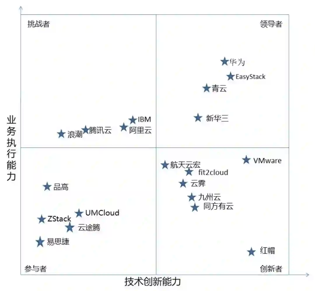 通过对当前中国金融行业IaaS服务提供商进行系统的评估,我们能够看到华为、EasyStack(易捷行云)、青云、新华三4家厂商成为目前中国金融私有云市场中处于领导地位的厂商。