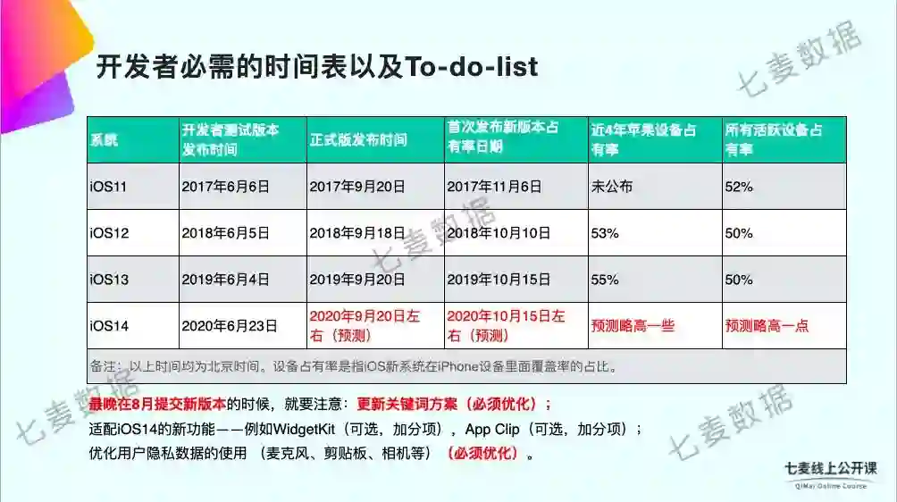 6 月 30 日,七麦线上公开课诚邀七麦数据 CEO 徐欢重磅带来增长er必须关注的时间表及 To do list,深度解读了苹果 WWDC20 之后的新内容和新变化,并给予开发者相关建议。七麦研究院特此整理内容重点,以供开发者、运营推广人回顾。