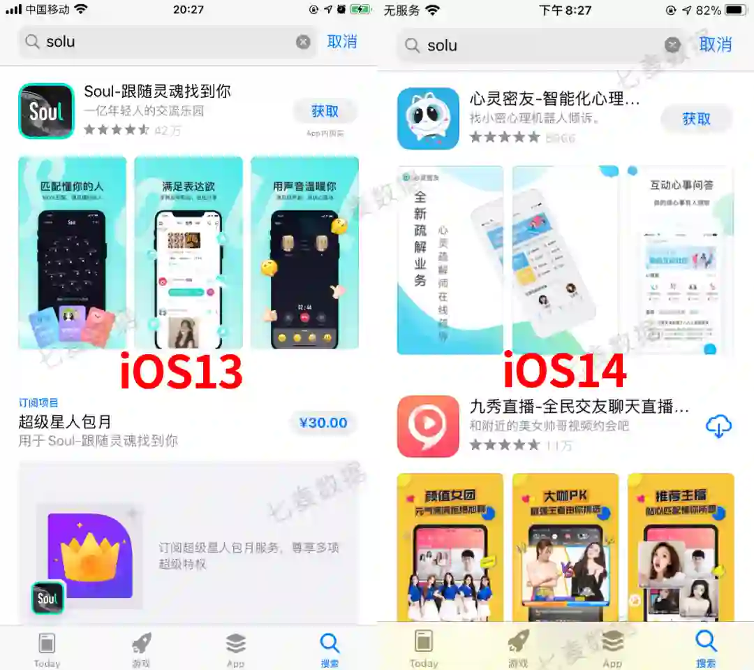 搜索 solu 时,会自动纠正成 soul,如果坚持选择搜索 solu,出来的搜索结果也会和 iOS13 系统不一样。
