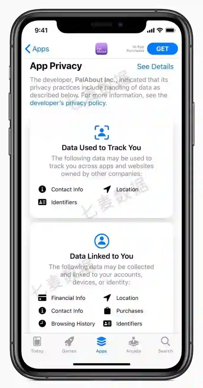 早在 iOS12、iOS13 发布的时候,苹果就已经加强了对隐私功能的升级,此次 iOS14 的发布再次把用户隐私推到了一个新的高度。例如,在 App Store 产品详情页中,所有 App 必须向用户展示出将会收集和使用哪些数据和权限,用户在下载前就可以了解到这款 App 将会使用哪些数据,从而决定是否要下载。苹果给出了下方的示意图: