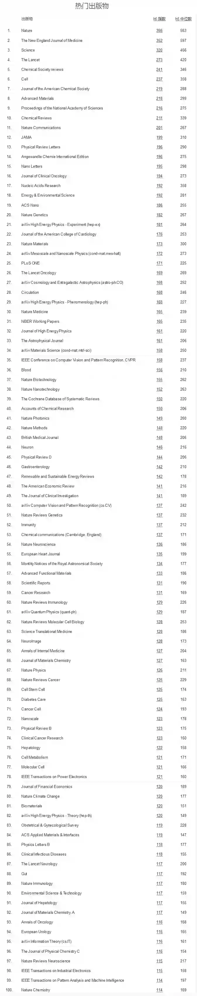 其中,《自然》(Nature)、《新英格兰医学杂志》(NEJM)与《科学》(Science)名列前三。