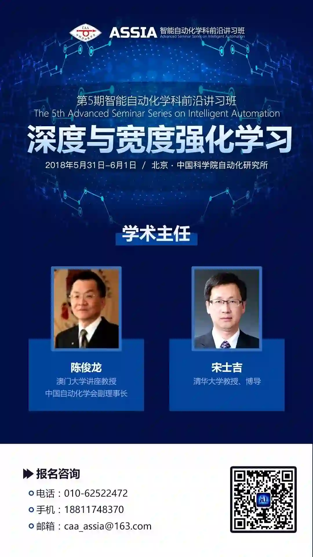 中国自动化学会将于2018年5月31日-6月1日在中国科学院自动化研究所举办第5期智能自动化学科前沿讲习班,主题为“深度与宽度强化学习”,此次讲习班由中国自动化学会副理事长、澳门大学讲座教授陈俊龙与清华大学教授宋士吉共同担任学术主任。