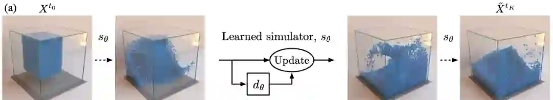 从下图可见,模拟器sθ的用处,是将这块流体输入到一个动力学模型dθ中,并将产生的一帧帧结果用于更新物体变形的过程。