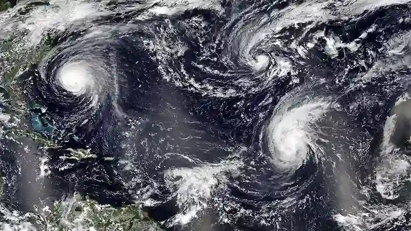 2018年9月12日,四个热带气旋活跃在大西洋:佛罗伦萨(左),海伦(右),艾萨克(底部)和乔伊斯(中)。 这是自2008年以来首次有四个命名风暴同时出现。(NATIONAL OCEANIC AND ATMOSPHERIC ADMINISTRATION)