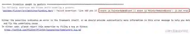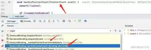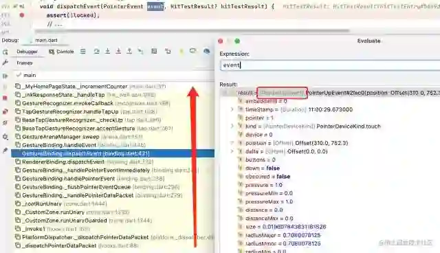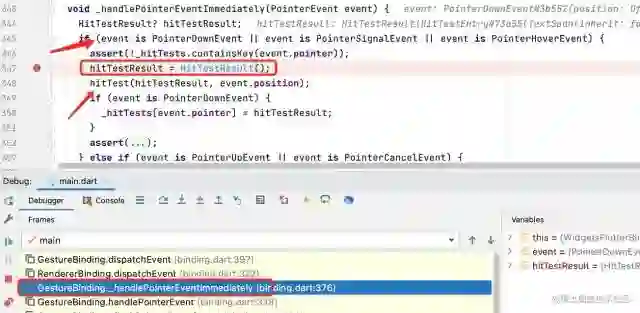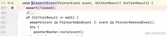 下面通过调试来看一下 GestureBinding#dispatchEvent 的逻辑处理: 402 行表示,当 hitTestResult 为 null 时,当前的 event 对象类型必须是 PointerAddedEvent 和 PointerRemovedEvent。而我们上面传入 PointerDownEvent,使用肯定会抛异常。