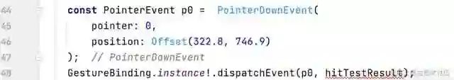 void _pressAdd() {const PointerEvent addPointer = PointerAddedEvent(pointer: 0,position: Offset(322.8, 746.9));const PointerEvent downPointer = PointerDownEvent(pointer: 0,position: Offset(322.8, 746.9));const PointerEvent upPointer = PointerUpEvent(pointer: 0,position: Offset(322.8, 746.9));GestureBinding.instance!.handlePointerEvent(addPointer);GestureBinding.instance!.handlePointerEvent(downPointer);GestureBinding.instance!.handlePointerEvent(upPointer);}