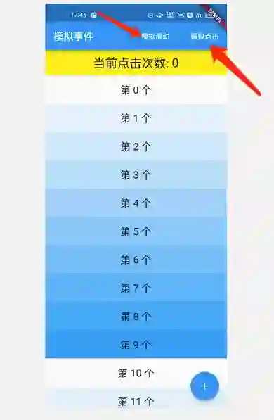 如下效果所示: 通过模拟点击可以点击右下角的加号按钮,从而让上面黄色区域内的数字自加;通过模拟滑动让列表滑动。这样我们就实现了通过代码来触发手势事件。