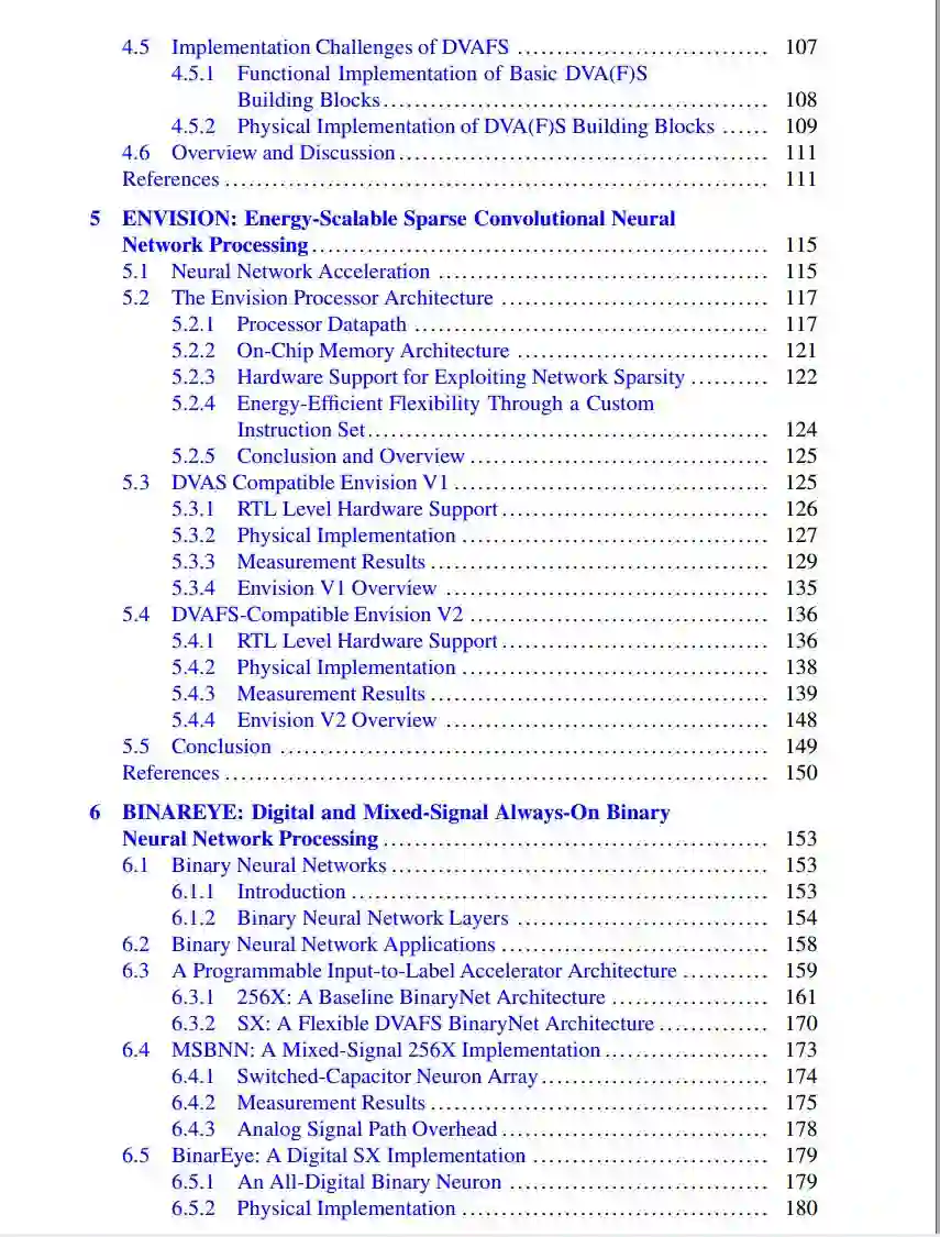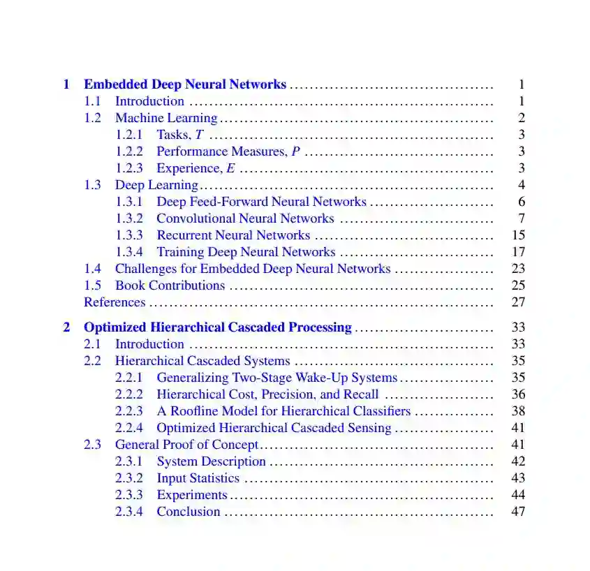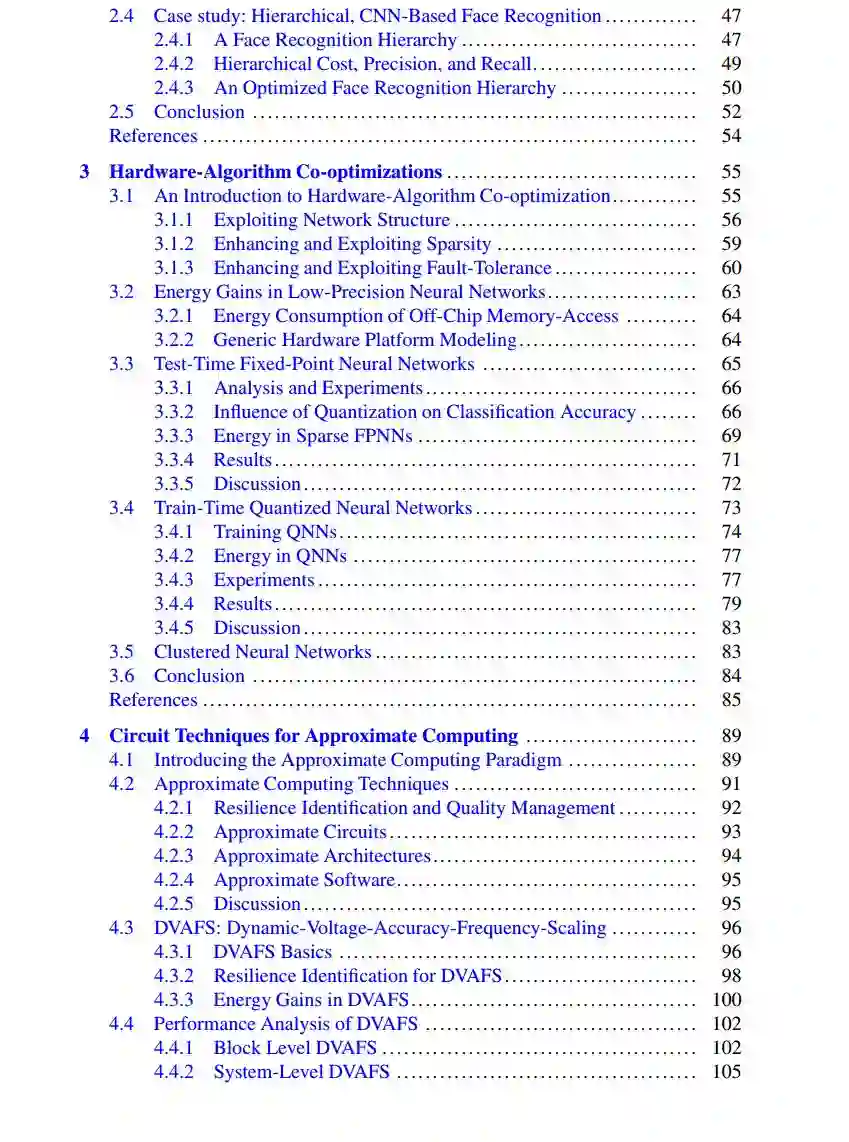 在可穿戴设备上,只有在计算平台支持的能量和功率预算范围内,这些深度学习算法能够以更节能的方式运行,才能实现边缘计算。为了实现这一点,在应用程序的设计层次结构的所有级别都需要几项创新。可以为更具统计效率的深度学习算法开发更智能的应用程序,这些算法反过来应该运行在基于专门定制电路的优化硬件平台上。最后,设计师不应该单独关注这些领域,而应该共同优化硬件和软件,以创建能耗最低的深度学习平台。本书概述了设计这种系统的可能解决方案。