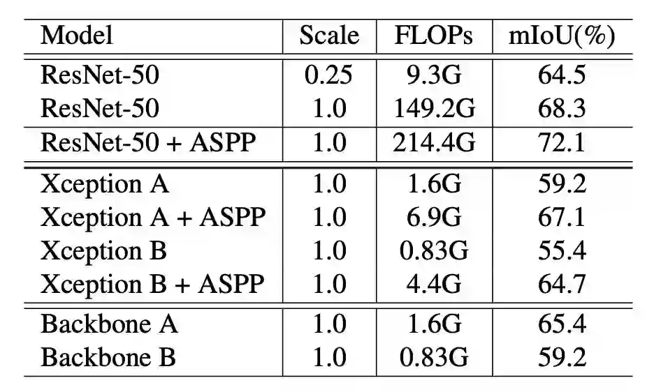 通常,使用 Xception 等“轻量级”编码器会导致精度极大下降(如上表所示,把 ResNet-50 换成 Xception 最多可以导致 9% 的 mIou 下降)。缓解该问题有个方法,即通过增加多层次特征聚合来减轻编码器容量减小所带来的冲击。