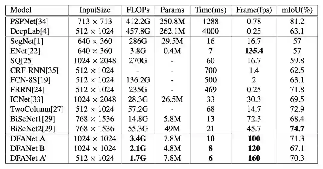 可以说,在计算量受限的前提下,DFANet 是第一个能在高分辨率图片上达到准确度媲美主流“大模型”的轻量化网络。