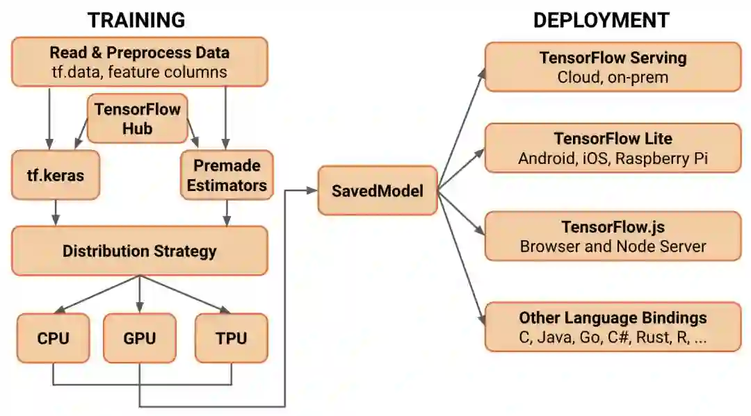 在过去的几年中,开发团队为TensorFlow添加了许多组件,而在2.0版本中,这些组件将被打包成一个综合平台,可支持机器学习的工作流程(从训练到部署)。正如上图所示。