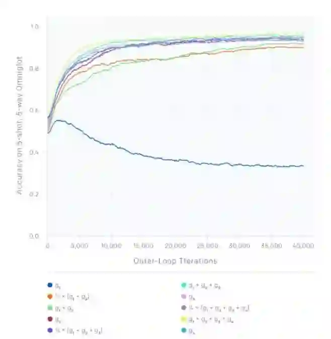 我们对Reptile的分析表明我们可以将随机梯度下降以不同方式结合,获得很多不同的算法。在下方的表格中,假设我们在每个任务中执行了k步随机梯度下降,生成了梯度g1,g2,…,gk。下面的图表显示出Omniglot上的学习曲线,它是将每个和看作元梯度获得的。g2对应的是MAML原始论文中提到的一阶MAML。由于方差缩减,梯度包含的越多就会生成越快的学习速率。需要注意的是,只使用g1(即对应k=1)在这一任务中是无法产生进步的,因为零次学习的性能无法改进。