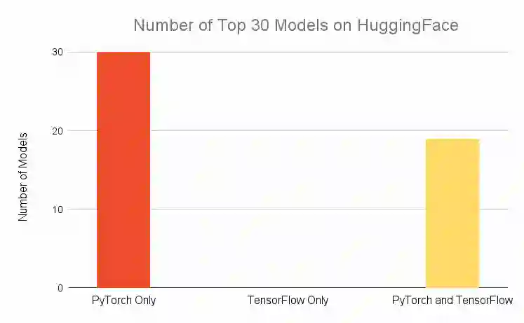 如果把范围缩小到 HuggingFace 上最受欢迎的 30 个模型,我们可以看到类似的结果。在这 30 个模型中,能在 TensorFlow 上用的还不到 2/3,但能在 PyTorch 上用的却达到了 100%,没有哪个模型只能在 TensorFlow 上用。