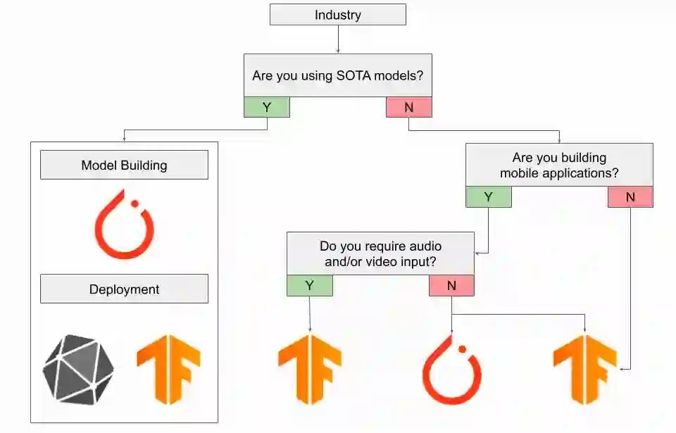 如果你正在构建移动应用,鉴于 PyTorch 最近发布了 PyTorch Live,可以考虑使用 PyTorch。如果你需要音频或视频输入,在这种情况下还是应该使用 TensorFlow。如果你正在构建使用 AI 的嵌入式系统或 IoT 设备,鉴于 TFLite + Coral 生态系统,你仍然应该使用 TensorFlow。