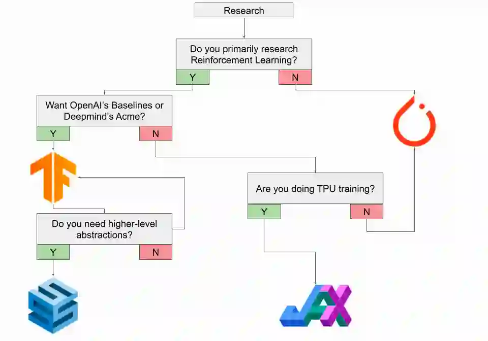 当然,这条规则有几个值得注意的例外,最值得注意的是:强化学习领域的一些研究应该考虑使用 TensorFlow。TensorFlow 有一个用于强化学习的原生 Agents 库,并且 DeepMind 的 Acme 框架是在 TensorFlow 中实现的。OpenAI 的 baseline 模型存储库也是在 TensorFlow 中实现的,尽管 OpenAI 的 Gym 在 TensorFlow 或 PyTorch 中都能使用。如果你打算使用 TensorFlow 进行研究,还应该查看 DeepMind 的 Sonnet 以获得更高级别的抽象。