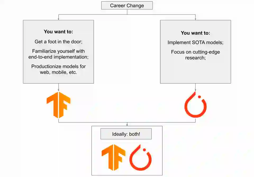 如果想在职业生涯中寻求一些转变,PyTorch 或 TensorFlow 都是不错的选择。在这种情况下,你可以做的最重要的事情是证明自己可以带来额外价值,因此拥有复合项目经验至关重要。将深度学习应用于创造性用例来打破常规,或者通过端到端的项目表明自己已做好迎接行业的准备,都能让自己处于不败之地。