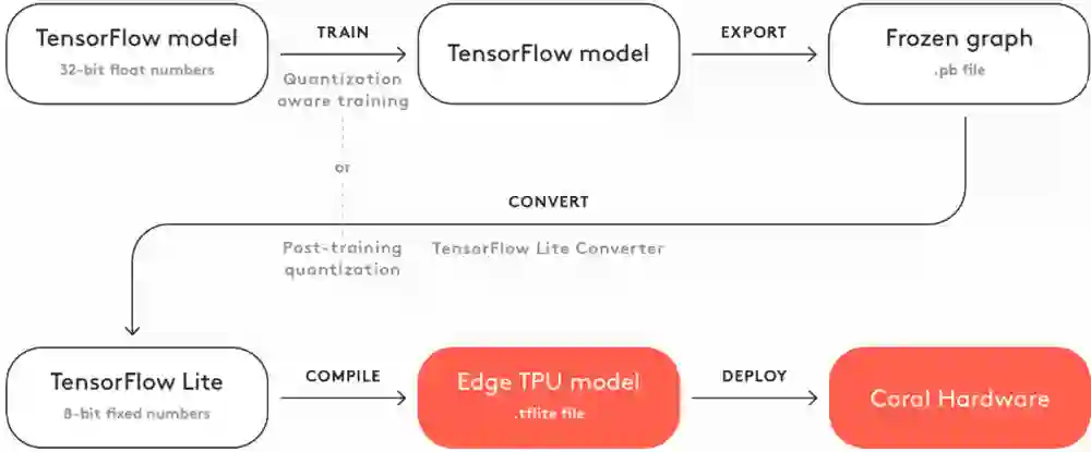 Coral 提供了一系列用于原型设计、生产和传感的硬件产品,其中一些本质上是增强型的树莓派,专为 AI 应用程序创建,能够利用 Edge TPU 在低功耗设备上进行高性能推理。Coral 还提供用于图像分割、姿态估计、语音识别等任务的预编译模型,为希望创建本地 AI 系统的开发人员提供支持。创建模型的基本步骤如下面的流程图所示。