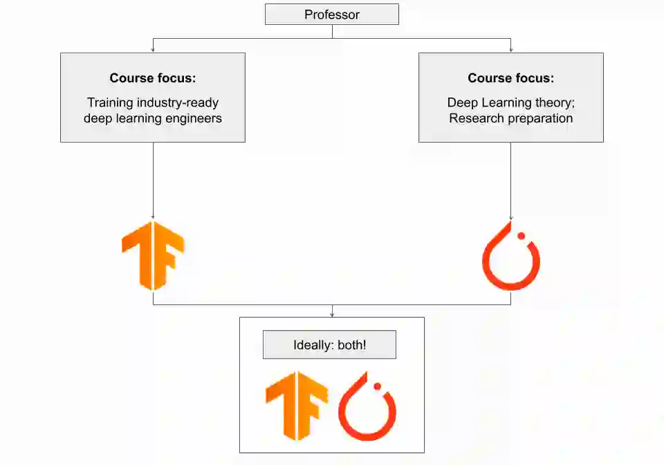 理想情况下,学生应该接触每个框架,尽管单个学期的时间有限,但花一些时间来了解框架之间的差异可能很有价值。如果课程是机器学习大型课程的一部分,其中有许多课程专门针对不同的主题,最好坚持使用最适合课程材料的框架,而不是尝试同时接触两者。