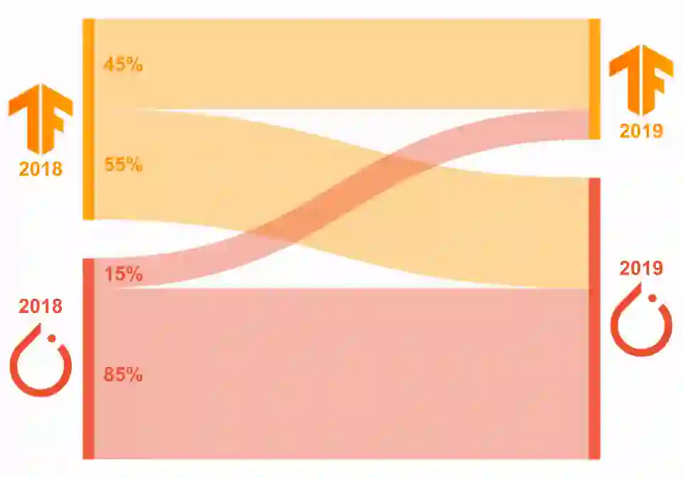 如果看一下那些中途换框架的研究者的比例,我们也可以得出类似的结论。如下图所示,在 2018 年还在用 TensorFlow 的论文作者中,有 55% 的人在 2019 年转向了 PyTorch,但 2018 年就在用 PyTorch 的人有 85% 都留了下来。