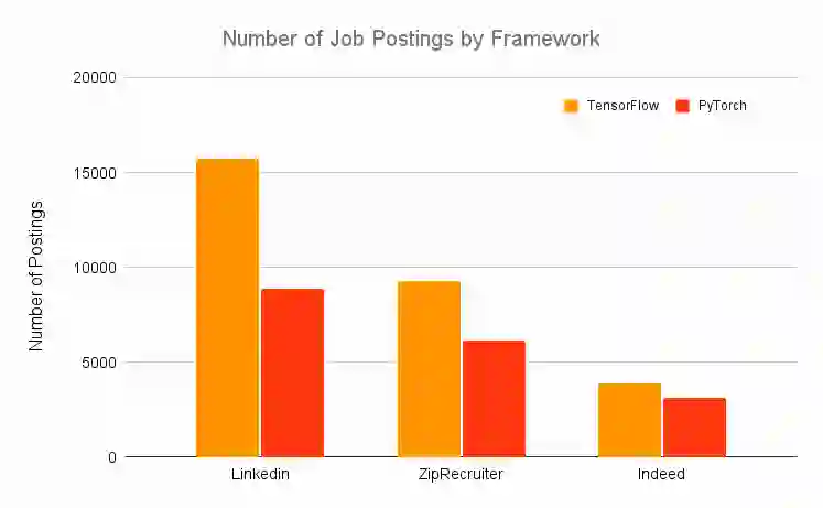 因此,建议使用可以让你工作更轻松的任何框架,这比熟悉特定框架的 API 重要得多。话虽如此,如果你对框架完全不熟悉,请使用 TensorFlow,因为它是首选的行业框架。下图中汇总了各种职业网站的每个框架职位的发布数量,TensorFlow 远远超过了 PyTorch。