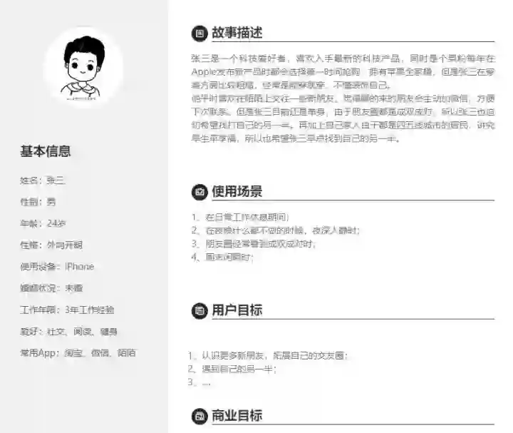 在整理好用户基础数据后我们需要把数据进行打包归类,加上具体的描述文字,创建出基本的用户架构(用户画像),比如一款社交产品的用户信息提取出来后可以形成一个大致的用户状态,如下所示: