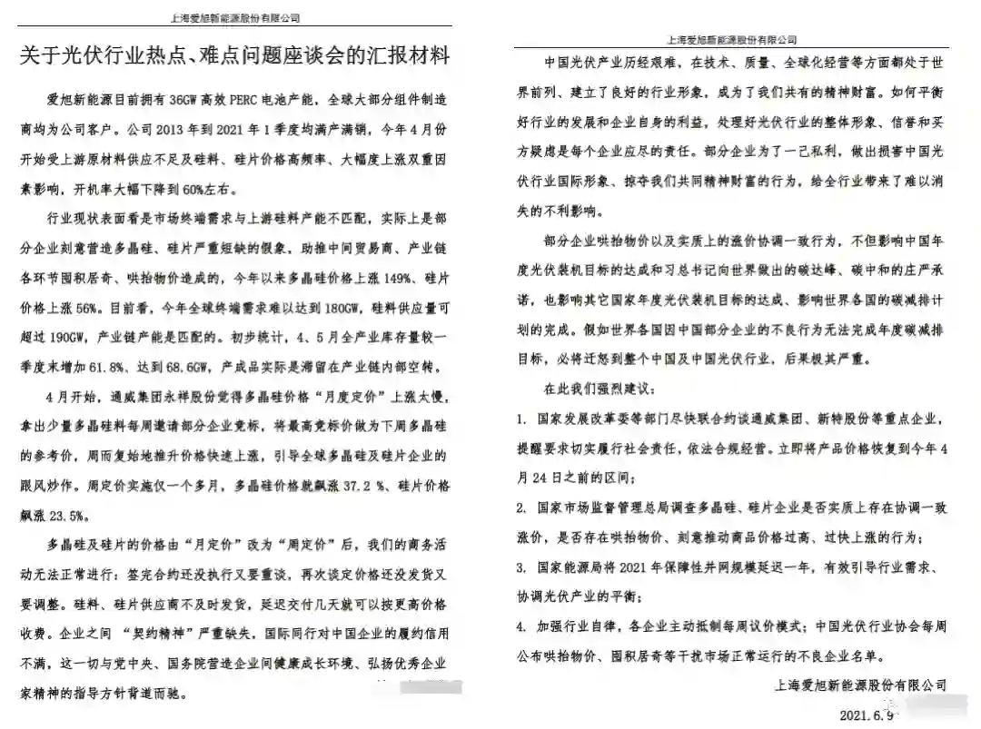 就在爱旭提交材料第二天,召开座谈会的光伏行业协会也发布了一则呼吁,号召从业者们抵制过度囤货、哄抬物价和投机行为。