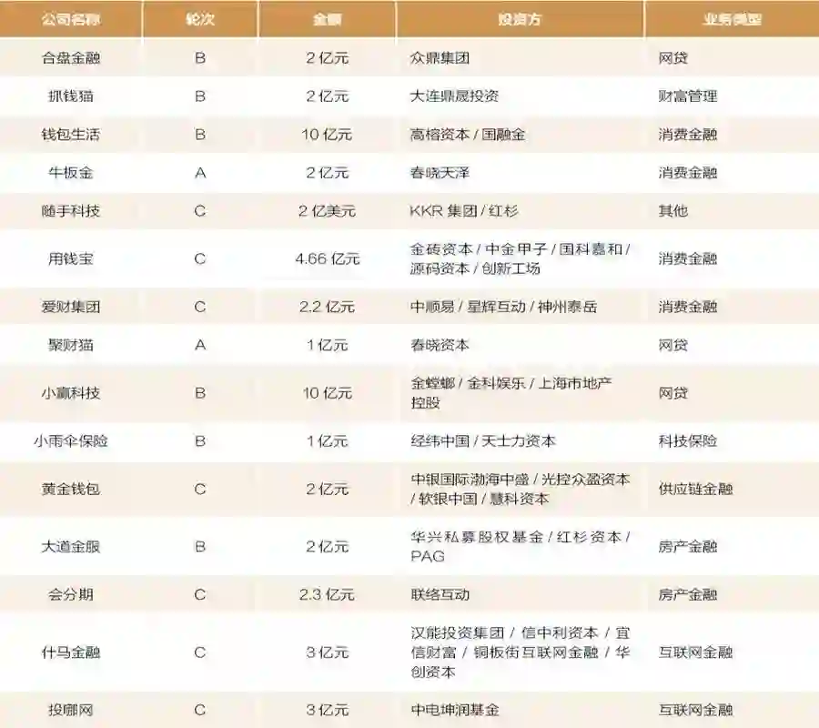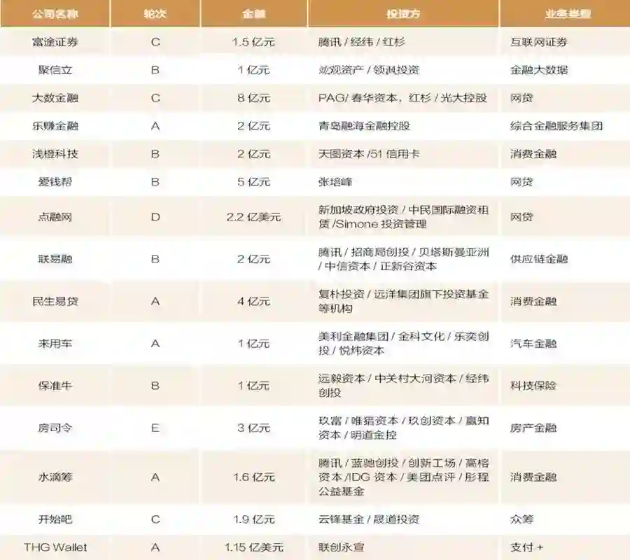 2017到2018年5月, 投融资过亿的金融科技公司达到32家, 融资轮次覆盖A轮到E轮, 其中B轮和C轮最多, 各有 11家; A轮紧随其后, 达到8家; D轮和E轮各一家。 融资额度在10亿人民币以上的有两家, 点融网和随手科技。 融资企业业务大多集中在互联网金融、消费金融和第三方支付, 商业模式以B2C居多。